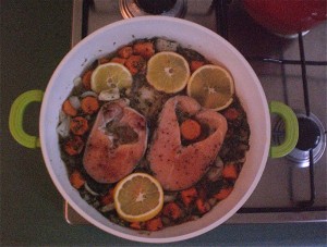 מצרכים: פרוסות דג פילה קפוא או טרי, 2-3 בצל, 4-5 גזר, 1 תפוז