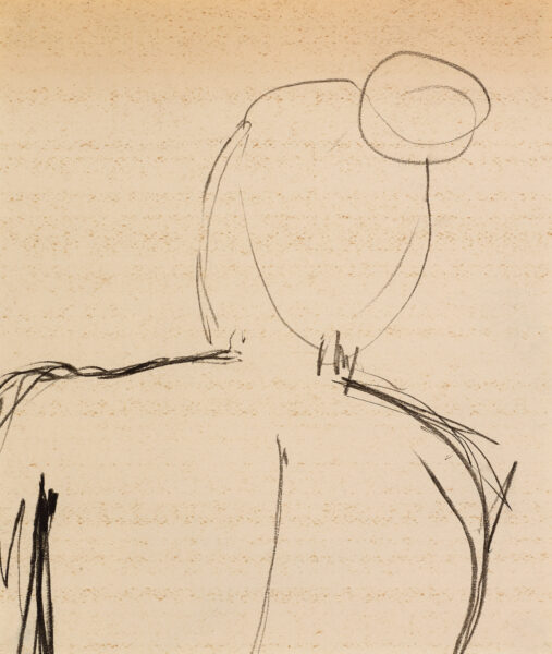 המָשהו הפראי הראשוני שראיתי בתנוחה ובמראה המודל מובילים אותי – היד נעה במהירות והעבודה צומחת כמו מעצמה, רצה בין קצוות משולש – בין מראה המודל, הדימויים החזותיים המודפסים בחוברת בנושא מִגדר עליה ציירתי, ובין התחושות שלי.