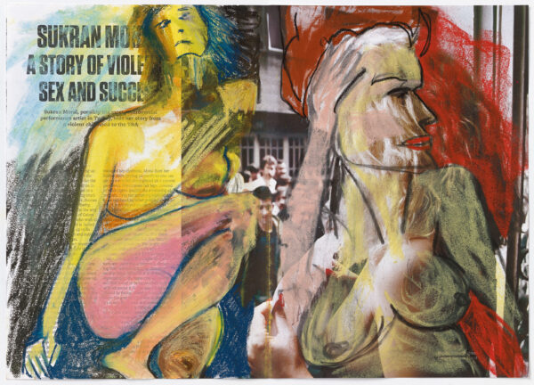 מודל, שתי תנוחות, פסטל ופחם, על חוברת בנושא מגדר ״ארטאפקט״ (Artefact Magazine) זוג העמודים הללו לא הופיע בתערוכה 2018
